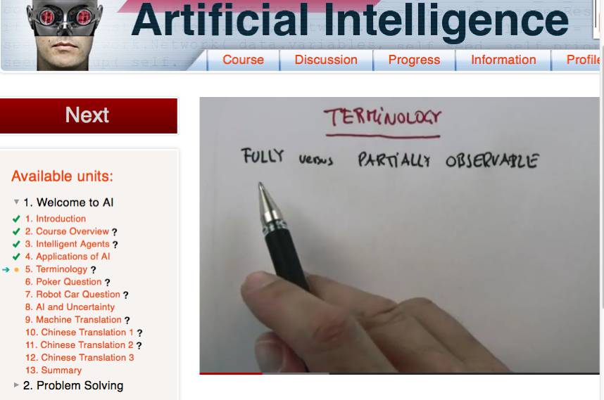 Here you see unit 1, Welcome to AI, in which the video lecture runs on the right with progress checked off on the left. I can check my progress on quizzes with the Progress tab across the top.