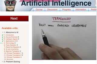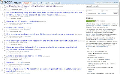 The first homework assignment was posted today. I had to finish up state spaces, sliding blocks puzzle, and problems with search before attempting homework. Apparently, my homework answers are saved, but I can go back anytime before the due date to change answers. I feel about 80% confident in my responses. I think I'll sleep on them a few days, read the text, review prior lessons and take a final shot at it on Saturday. In the meantime, I hope to explore the reddit forums and the #AICLASS hashtag on Twitter to connect with other students.