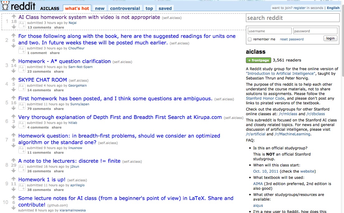 I'm definitely not as confident in my success on homework #2 as I was on homework #1. The probability equations were challenging. I guess I'm more interested in observing learner behavior. The course confirms that most students do procrastinate. I, like many others, popped in at the last minute on Monday to find that we had a 24 hour extension on homework. Server crash. Apparently, too many people trying to finish up in the final hours. Even more interesting was doing a quick Internet search on Bayes Rule to find the first three hits were also churning. Guess a lot of folks were searching for content support. Still no discussion forum on the course site, but I'm getting a daily digest from http://www.reddit.com/r/aiclass . My goal is to do a better job keeping up this week. Time for a coffee break!